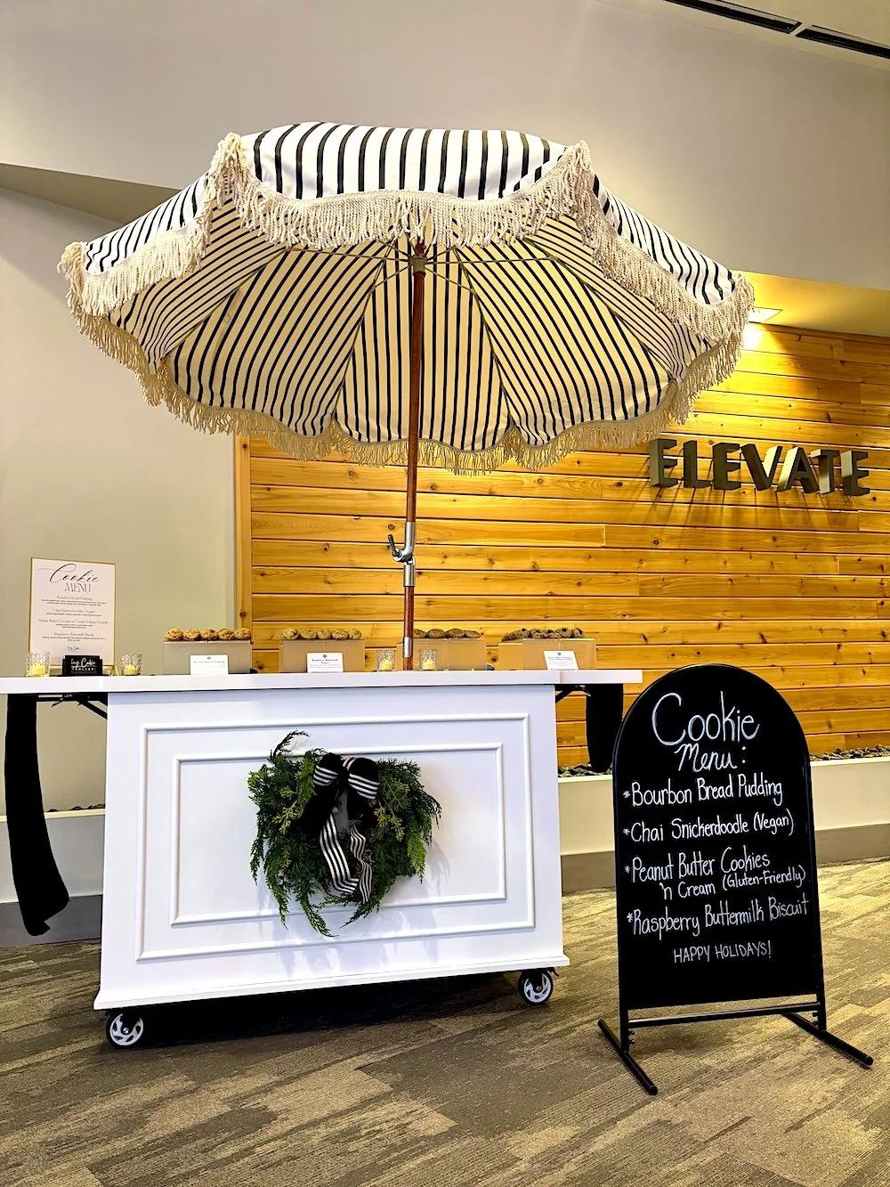 Our signature umbrella-style cookie cart (choice of terracotta red or black and white striped)